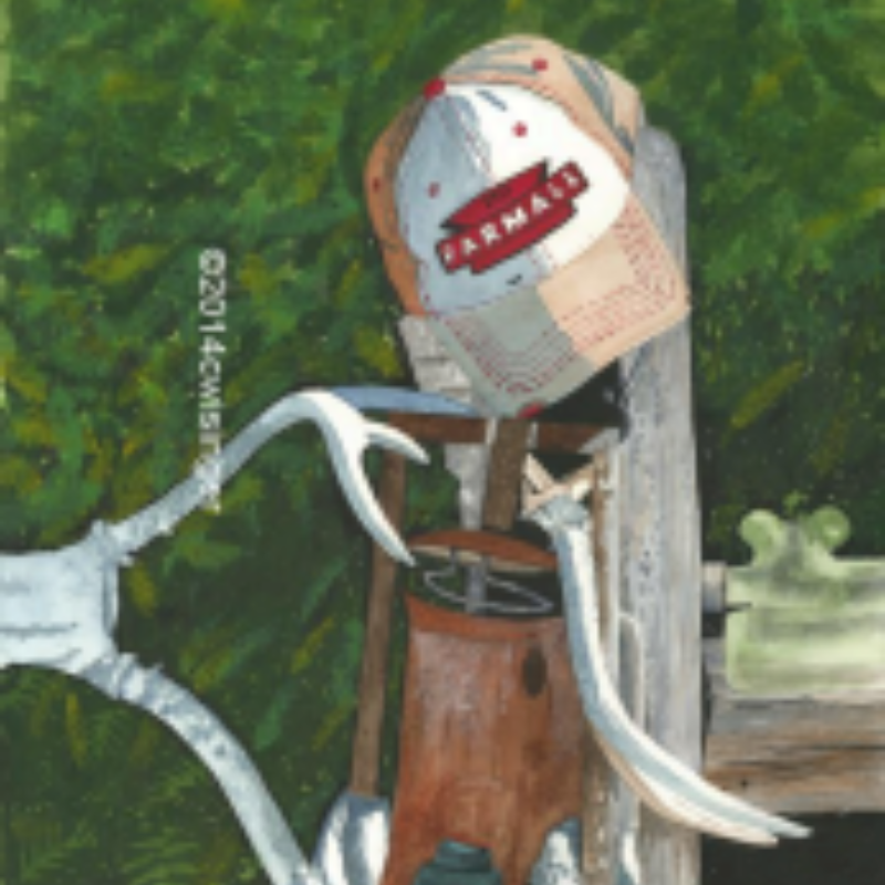 This painting with the old Farmall cap carries that classic International Harvester red, softened by sun and sweat, with a sun-bleached whitetail rack hanging like a pale crown. It’s an awesome collection from our life that we call “Yard Art” in the south.