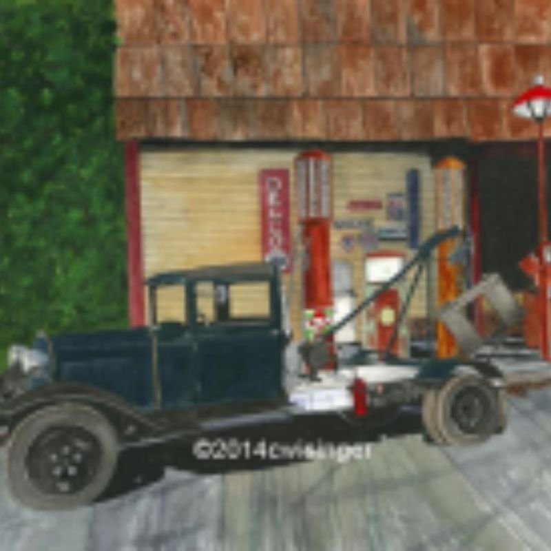 A weathered work truck and old fuel pumps mark the edge of the road—symbols of departures and returns. The piece reflects God’s steady care over every journey.