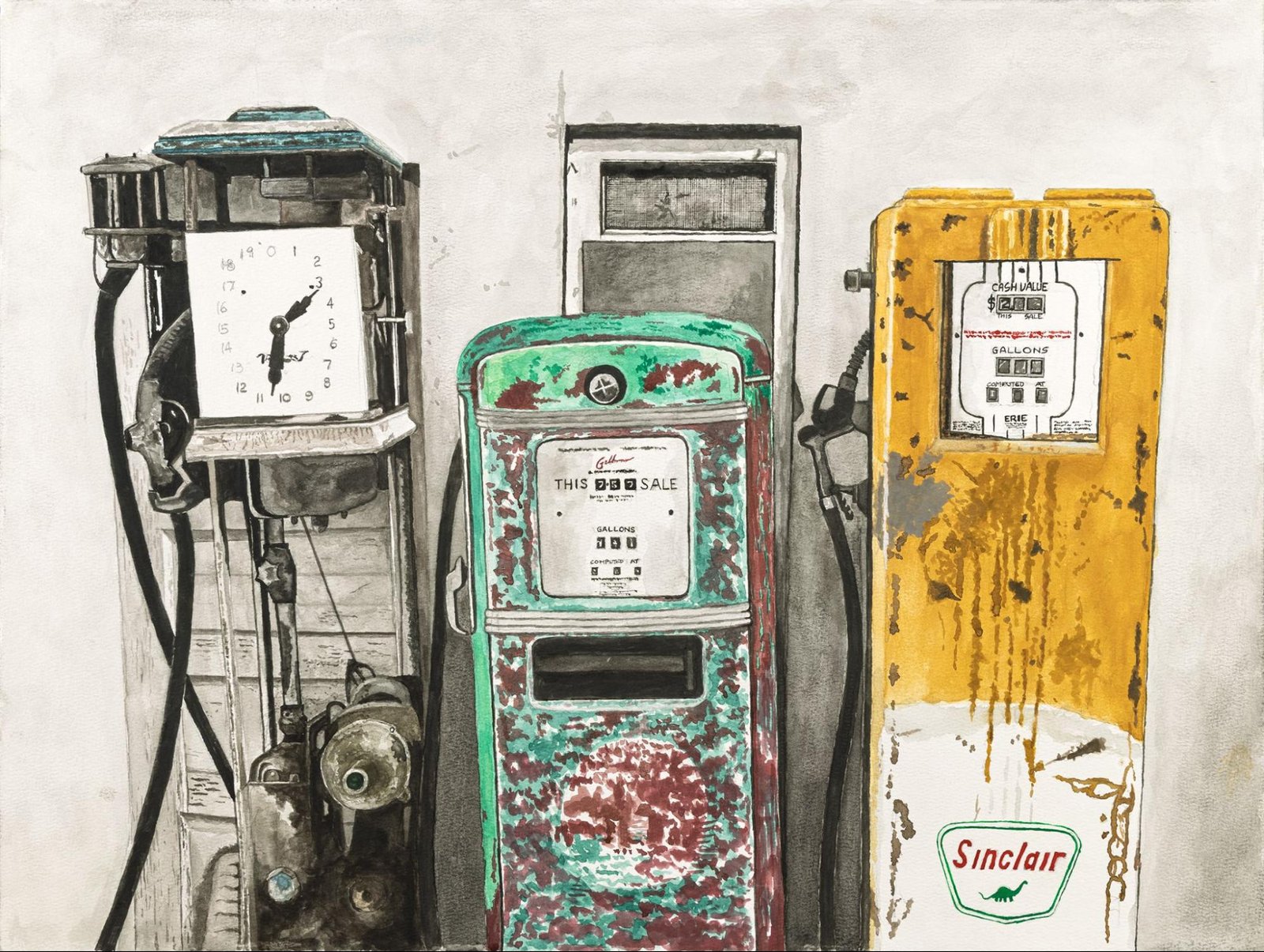Three timeworn pumps stand shoulder-to-shoulder and invites the viewer to pause and consider where true filling comes from. Though these old pumps once fueled engines, now has come a time to rest.